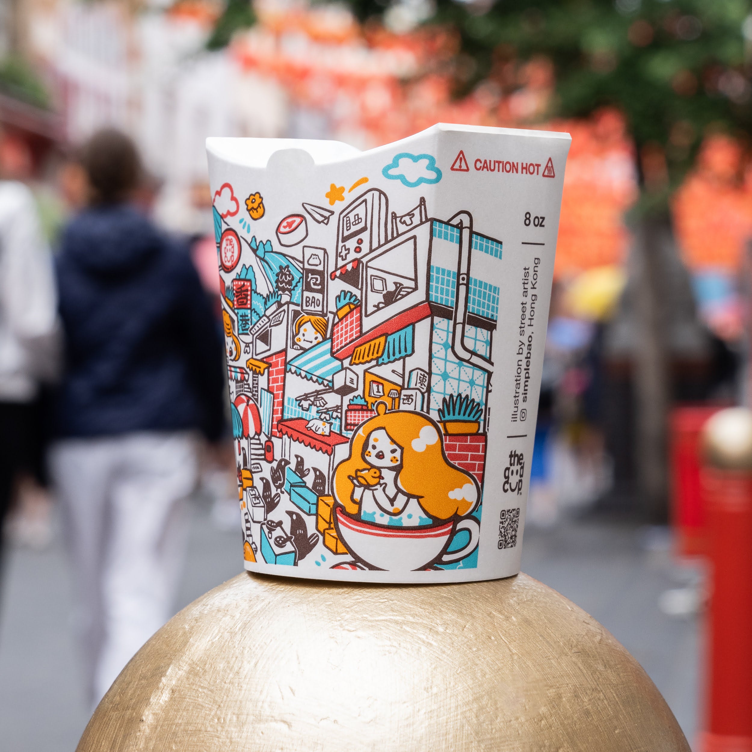 It’s a 100% paper cup with an aqueous coating that folds into a secure sip opening, replacing the need for plastic lids.